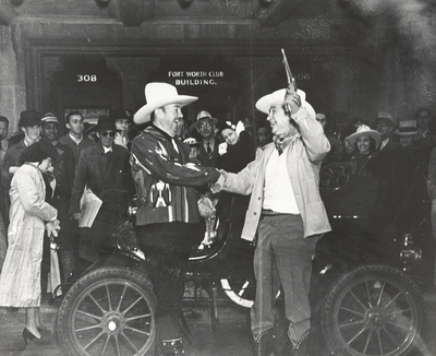 Amon G. Carter, Sr. and bandleader Paul Samuel Whiteman outside the Fort Worth Club during Fort Worth's Frontier Centennial. Both men are in western wear and cowboy hats standing in front of a carriage. Mr. Carter is raising a gun in his left hand into the air. A crowd of people are watching behind the carriage.