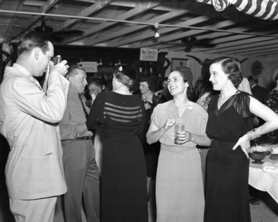 Paul Whiteman's watermelon party at Shady Oak Farm; Mrs. Elliott Roosevelt [Ruth Googins Roosevelt] and Mrs. Paul Whiteman [Margaret Livingston] having their photo taken by another guest, summer 1937