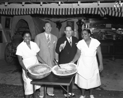 Paul Whiteman's watermelon party at Shady Oak Farm; Paul Whitemn and unidentified man with 2 female servers holding watermelons, summer 1937