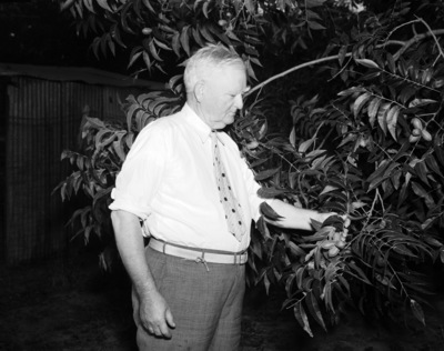 Vice President John Nance Garner's home, Uvalde; Vice President Garner looks at pecans growing on his land, 1938