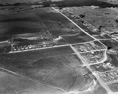 Air view of Blue Bonnet addition south of Texas Christian University (TCU) and Berry St., Fort Worth, Texas, 1939.