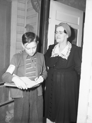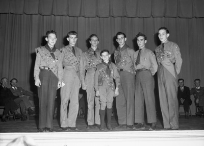 Boy Scout Week. Mrs. John M. Tomkins pins badge on her son, Milton Tompkins