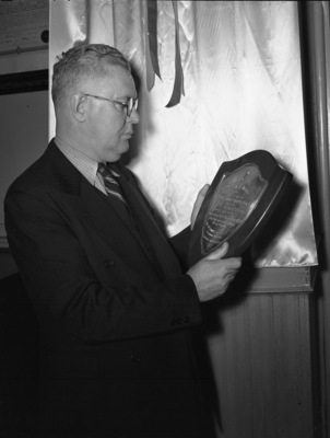 James O' Connell Junior is grand knight of the Knights of Columbus. He is shown holding the silver plaque honoring the memory of Monsignore Robert M. Nolan. The plaque was unveiled Thursday night at a service in the K. of C. Club. Mr. O' Connell is dressed in a three piece, double breasted suit and is looking at the plaque. Published in the Fort Worth Star-Telegram morning edition, February 23, 1940.