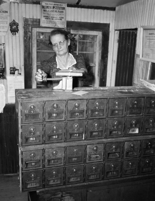 Commissioners' Court authorized the filing of a condemnation suit, but Mrs. Agnes Wakefield, the postmaster says there's no argument. In this picture, Mrs. Agnes Wakefield is standing behind a mail box for the townspeople, sorting mail. Published in the Fort Worth Star-Telegram morning edition, October 21, 1941.