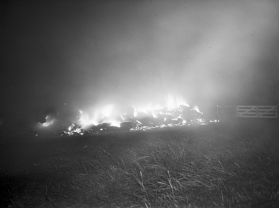 Image shows Complete destruction took place Monday night at the Fort Worth Cavalry Club, when a fire destroyed Beasley Stables. An estimated twenty-four horses were killed in the blaze. The fire is shown occuring with smoke surrounding the open field. Published in the Fort Worth Star-Telegram mornig edition October 21, 1941.