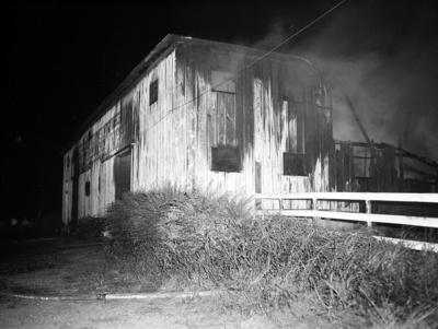 Image shows Complete destruction took place at the Fort Worth Cavalry Club, when a fire destroyed Beasley Stables. An estimated twenty-four horses were killed in the blaze. The exterior of the Beasley Stables is shown. Published in the Fort Worth Star-Telegram morning edition October 21, 1941.