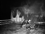 Image shows Complete destruction took place at the Fort Worth Cavalry Club, when a fire destroyed Beasley Stables. An estimated twenty-four horses were killed in the blaze. Four unidentified firefighters are shown with fire hose combating the fire. Published in the Fort Worth Star-Telegram morning edition October 21, 1941.