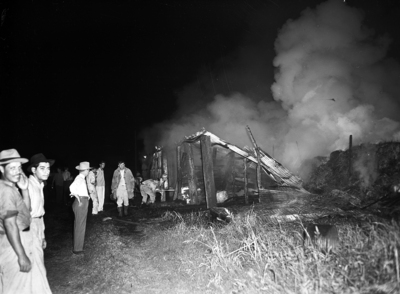 Image shows Complete destruction took place at the Fort Worth Cavalry Club, when a fire destroyed Beasley Stables. An estimated twenty-four horses were killed in the blaze. A crowd is gathered around the smoldering Beasley Stables. Published in the Fort Worth Star-Telegram morning edition October 21, 1941.