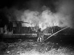 Image shows Complete destruction took place at the Fort Worth Cavalry Club, when a fire destroyed Beasley Stables. An estimated twenty-four horses were killed in the blaze.A unidentified firefighter is shown with fire hose combating the fire. Published in the Fort Worth Star-Telegram morning edition October 21, 1941.