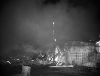 Image shows Complete destruction took place at the Fort Worth Cavalry Club, when a fire destroyed Beasley Stables. An estimated twenty-four horses were killed in the blaze. Rubble is shown to be burning as part of the Beasley Stables. Published in the Fort Worth Star-Telegram morning edition October 21, 1941.