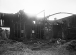 Image shows Complete destruction took place at the Fort Worth Cavalry Club, when a fire destroyed Beasley Stables. Twenty-four horse were killed. Among the animals lost were some of the top show horses in the United States. Owners of some of the horses, stable attendants, and others were shown as they inspected the blackened ruins of the stable. The loss was estimated at $100,000. Published in the Fort Worth Star-Telegram evening edition October 21, 1941.