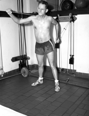 Image shows F. C. Bradley, a salesman, getting his daily workout at the Young Men's Christian Association health club gymnasium. He is standing in health club room full of gym equipment, pulling on ropes attached to a pulley on the wall. Published in the Fort Worth Star-Telegram morning edition, October 21, 1941.