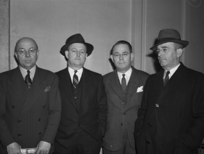 The annual district meeting of the Texas Bankers Association is being held at the Hotel Texas. In attendance left to right are W. H. Ogilvy, C. B. Shepard, W. B. Gilbert, and Suttle Roberts. Mr. Ogilvy works as the assistant cashier of the First National Bank in San Angelo, Texas. He is dressed in a double breasted pinstripe suit. Mr. Shepard works at the Mercantile Commercial Bank in St. Louis, Missouri. He is dressed in a hat and a three piece pinstripe suit. Mr. Gilbert is vice president of the Dallas National Bank in Dallas, Texas. He is wearing a three piece suit. Mr. Roberts is president of State National Bank in Corsicana, Texas. He is dressed in a hat, suit, and a coat. They are all standing next to each other. Published in the Fort Worth Star-Telegram evening edition, February 22, 1940.