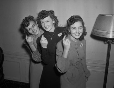 Left to right, sisters Dorothy Lee, Helen Lee, and Mary Louise Lee are three of the hundreds of young women who have been recruited by the United Service Organization (U. S. O.) to be dance partners at the U. S. O. soldiers dance in the Crystal Ballroom of Hotel Texas. The sisters are standing against a wall. Dorothy is wearing a dress with polka-dot sleeves. Helen is wearing a dark-colored dress and a cross necklace. Mary Louise is wearing a long-sleeve dress with buttons down the bodice. At the far right is a floor lamp.