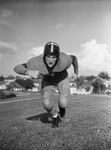 James Woodman is a senior tackle on the Polytechnic High School football team. He is one of the hardest hitting boys of the Poly front wall. The Parrots rugged line is piling-up lots of praise for their blocking early this season. Woodman will continue to see major service time in their upcoming game against Breckenridge High School. Woodman is shown on the practice field, working on his stance. He is dressed in a football uniform and a helmet. A residential neighborhood is in view beyond the grassy field. "(Star-Telegram Photo.)" Published Star-Telegram Eve. Oct. 30, 1941.