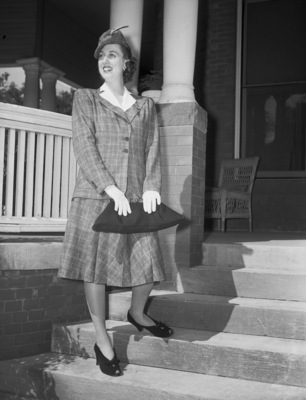 Miss Deirdre Dyche, of New York, is visiting her parents, Mr. and Mrs. T. G. Dyche, in Fort Worth, Texas. During her month long vacation, Miss Dyche will also travel to California, accompanied by her mother. Miss Dyche will stop in Fort Worth, Texas, again on her return trip to New York. She is shown standing on the front steps of her parent's home. She is wearing feather hat, collared blouse, a tartan blazer and a matching skirt.