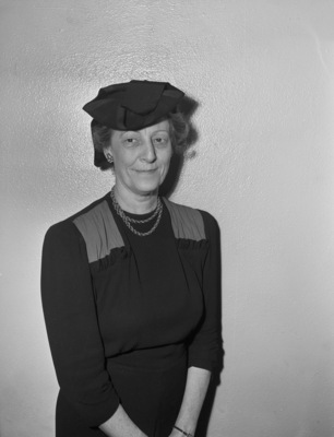 Miss Irene Headley Armes is the director of field service with the National Business and Professional Women's Clubs (N. B. & P. W.) in New York, New York. She is in Fort Worth, Texas, as an impromptu guest and informal speaker at the local B. & P. W. Club luncheon at the Hotel Texas. Miss Armes is discussing ways by which individual clubs can aid in strengthening democracy for defense. Mrs. Armes is shown standing against a wall. She is wearing a hat, dark dress, and a necklace.