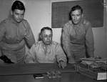 The United States Army is constructing a Quartermaster Depot just south of the Fort Worth, Texas city limits. The project will cost a total of two-million-dollars. The site is projected to be completed by June 1, 1942, including an 80 employee office. Discussing the project, left to right, are Second Lieutenant Garland D. Crawford, Major A. C. Bradley, and Captain Carl D. McWade. Lieutenant Crawford is a property and guard officer. Major Bradley is the Constructing Quartermaster on the project. Captain McWade is an executive officer. All three men are dressed in their military uniforms.