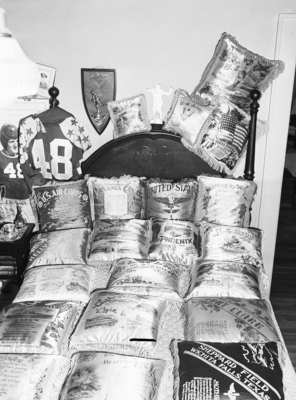Evidence that Lena Pope Home boys now in Uncle Sam's service aren't forgetting the home or its "mother," Mrs. E. H. Pope, are these souvenir pillows sent her from points as far away as China, Greenland and Alaska, by her former "boys" who are in all branches of the service. The souvenir pillow idea was started last Mothers Day by six service men on furlough who came back to visit the home where they spent their childhood. The various pillows are displayed on a bed and over the headboard. Most pillows commemorate a state, a branch of service or a poem about mother. Most pillows are of silk material with tassels in the borders. At one end of the bed is a football "48" jersey and other football memorabilia. Published in the Fort Worth Star-Telegram morning edition, October 26, 1941.