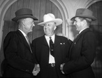 Reverend Marvin Cole (center), of Oklahoma City, known as the cowboy evangelist, had a broad-brimmed hat to help him look the part Thursday. It was presented him at Rosen Heights Baptist Church Tuesday night while the audience stood and sang "The Eyes of Texas". Reverend Cole, shown here with Reverend Jesse Garrett (left), pastor, and Roland Leath, choir director, began a two-week revival at the church Sunday. He is the chairman of Baptist evangelist work in Oklahoma. The three men are standing and all are smiling. Reverend Cole is wearing a dark colored suit with a light colored cowboy hat. Reverend Garrett and Mr. Leah are wearing dark colored suits and hats. Star-Telegram Evening Edition Oct. 23, 1941