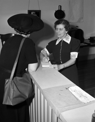 Tuberculosis patient (left) and Mrs. Sadie Wile, executive secretary of the Jewish Charities.The picture shows the story of how the patient is check in the office. Published in Fort Worth Star-Telegram, morning edition, October 29, 1941.