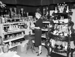 Mrs. O. K. Shannon, 1306 Elizabeth Boulevard, a member of the Woman's Club ways and means committee, which is staging an antique show in Anna Shelton Hall, holds an old doll from the collection of Mrs. J. W. Smalley of Dallas. She studies a colorful array of old glass in a corner of the booth of Mrs. Lillan Jones of Weatherford. Behind her an ornate and unusual piece of old furniture in the antique show. It is filled with glassware. Published in the Fort Worth Star-Telegram morning edition, October 25, 1941.