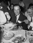 Roy Naugle, of Fort Worth, Texas, in attendance at a luncheon at Clifton, Texas, city hall. The luncheon was hosted by women of the Clifton Civic Improvement Society. Mr. Naugle is part of the delegation from Fort Worth, Texas, that attended the Central Texas Fair at Clifton, Texas. He is sitting at a dining table, sticking his fork into the plate of turkey in front of him. He is wearing a suit with a striped button-up shirt. An unidentified man is sitting beside him at the right.