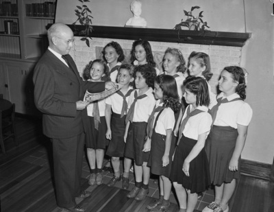 Guy Price, far left, president of the Fort Worth Council of Camp Fire Girls, Incorporated, presenting the charter to Fort Worth, Texas's, newest group, the Aiyupa Camp Fire group. The girls are, front row, left to right, Patty Nemetz, Peggy Claire Cox, Marjie Ruth Roberts, Mary Ann South and Anita Griffith; back row, left to right, Arliss Marie De Shazo, Beverly Coder, Joan Collard, Lenore Stockton and Betty Lou Berry. Mr. Price is standing in front of the new group, holding the charter in his hands. The girls are all dressed in their camp uniform, standing in front of a fireplace. On the fireplace mantel there are two potted plants and a bust sculpture.