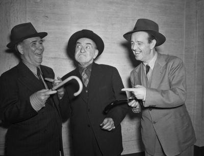 Blackface comedians, the Swor Brothers; left to right are John, Bert, and Jim Swor, rarely photographed out of blackface character, will be featured in the Great Mastodon Minstrels, in the Municipal Auditorium under Moslah Temple Shrine auspices.
