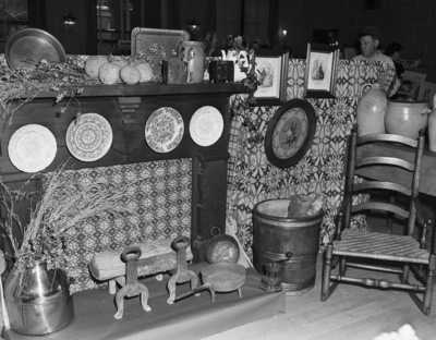 Early American household treasures decorate this fireside corner shown by Mrs. Helen Allen of Fort Worth in Anna Shelton Hall, the Woman's Club, at the antique show. Delft plates and a pair of Asiatic Pheasant plates hang over the fireplace, while at the side may be seen an old-fashioned rocking chair, and old butter tub for a wood basket, and old wooden frames in both square and oval shapes. Published in the Fort Worth Star-Telegram morning edition, October 26, 1941.
