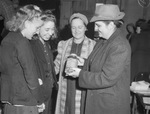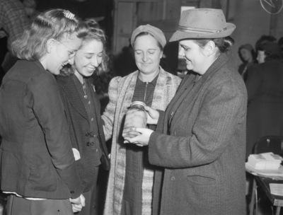 Standing left to right are Vonda Leigon, Margaret Rosser, Mrs. Jim Sisk and Miss Fannie Brown Eaton, county home demonstration agent, as they examined some of the canned vegetables at the Fifth Hockley County Jamboree and Fair. All four women are wearing coats. Miss Leigon is wearing eyeglasses and Miss Eaton is wearing a hat and holding a jar.
