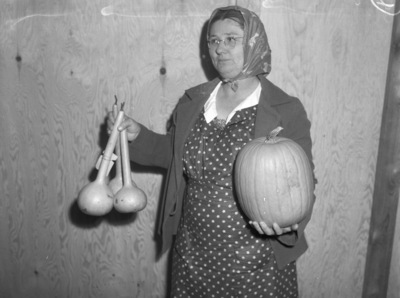 Mrs. D. H. Carpenter is holding gourds and a pumpkin that she grew three miles west of Levelland, Texas, at the Fifth Hockley County Jamboree and Fair. She is wearing a dress and a blazer, eyeglasses and a scarf around her head.