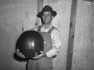 G. W. Reed shown holding one of his prize-winning watermelons that was grown seven miles southeast of Levelland, Texas, at the Fifth Hockley County Jamboree and Fair. He is wearing a long sleeve collared shirt and striped overalls, and a dark colored hat.