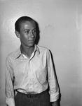 Eighteen year old Herbert Young enlisted in the United States Coast Guard. He is the son of Mrs. Hattie Young. Herbert is leaving for the training station near New Orleans, Louisiana. He is standing against a wall wearing a striped dress shirt and trousers.