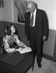 Students of sixty years ago are meeting today's students at the Birdville High School homecoming held in the school auditorium. Doris Bivins is registering Will C. Cantrell, seventy-five, of Fort Worth, Texas. Miss Bivins is a member of the girls' pep squad. She is wearing a shiny blouse, a skirt and a bow in her hair as she sits at the registration desk. Mr. Cantrell was a student in 1878 and has been associated with the townspeople while serving as manager of the Alta Vista Farm. he is dressed in a dark suit. There is an open window behind them.