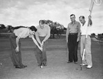 Here are the chief characters in the world's blind golf championship match at Rockwood golf course. At left, putting is Clinton Russell, world's champion from Duluth, Minnesota. Lining up Russell's clubhead is Jimmy Koehler, Duluth city golf champ who acts as the titlist's eyes, Minnesota. Second from right is Challenger Marvin Shannon of Fort Worth, Texas. Holding up the flag is Shannon's adviser and teacher, Sheet Fincher, Rockwood pro. Published in the Fort Worth Star-Telegram morning edition, October 24, 1941.