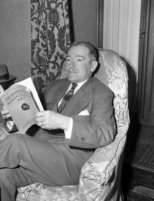 Wayman Adams is a well known American portrait painter. He is in Fort Worth, Texas, to paint the portrait of Dr. E. M. Waits, president of Texas Christian University. In a role reversal, Mr. Adams is shown posing for his portrait. He is staying at the Blackstone Hotel in Fort Worth, Texas. Mr. Adams is reading "The American Magazine of Art." He is dressed in a suit with a pocket square.