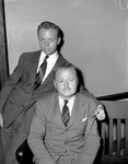 A father and son are both enrolled as students at Texas Christian University (T. C. U.). The freshmen Horned Frogs, left to right, are Wendell Towery and Roy E. Towery. Wendell, 18, has enrolled in regular classwork for the fall. He is dressed in a tweed suit. Mr. Towery has been called as pastor of First Christian Church of Handley, Texas. He has studied at T. C. U. for two years. He is wearing a striped suit with a pocket square.