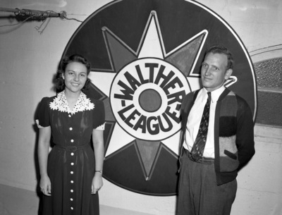 Loyal members of the Walther League, left to right, are Miss Maxine Luedtke and L. J. Hilscher. They are the secretary and president, respectively, of the St. Paul's Evangelical Lutheran Church Walther League. Miss Luedtke is wearing a button-up dress with a lace collar. Mr. Hilscher is dressed in a collared shirt, necktie, jacket, and trousers. They are shown standing in front of a large wooden insignia for the organization, located in the basement of the church.