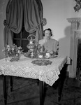 Mrs. Ralph A. Bristol will be opening her home on Wednesday for a Table Show. The event is being sponsored by the Fort Worth Garden Club. Mrs. Bristol is shown sitting at a table. She is wearing a short-sleeve button-up blouse. A silver tea set is arranged on a tray along with some china. Cookies are filling the other tray. Behind Mrs. Bristol are a fireplace and a window.