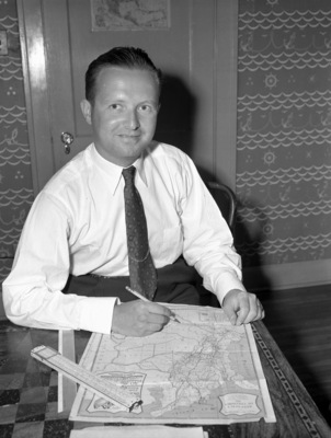 Eugenio Newman is a voluntary refugee from Nazi-controlled Austria. He is now living in Fort Worth, Texas, after spending three years in Columbia. Prior to Hitler's take-over, Mr. Newman was a city engineer in Vienna, Austria. Mr. Newman is shown sitting at his desk, marking on a map of Columbia. He is wearing a dress shirt, necktie, and trousers.