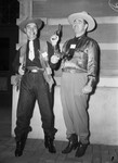 Gathered at the Santa Fe Depot were more than 100 Fort Worth, Texas, boosters attired in western regalia, getting ready to leave for Clifton, Texas, to observe Fort Worth Day at the Central Texas Fair. Standing left to right are Charles F. Williams and Reverend Hayden Edwards. Reverend Edwards and Mr. Williams are both dressed in western regalia, including cowboy hats, cowboy boots, button-up shirts and trousers. They are posing with handguns. Mr. Williams is pointing two pistols off to his left and Reverend Edwards is pointing his gun straight up. Mr. Williams has a cigar in mouth and Reverend Edwards has his eyes closed.