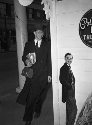 Thomas White is a music student at North Texas Agricultural College. He is on his way to see "Gone with the Wind" for the eleventh time at the Hollywood Theater. Mr. White is dressed in a hat, suit, and a long coat. He is carrying a newspaper and a Spanish book under his arm and a lunch pail for intermission. On the side of the building, there is a cutout of Clark Gable as Rhett Butler. He paid $9.60 to see the show the first eight times. Now he goes in free. Published in the Fort Worth Star-Telegram morning edition, February 24, 1940.