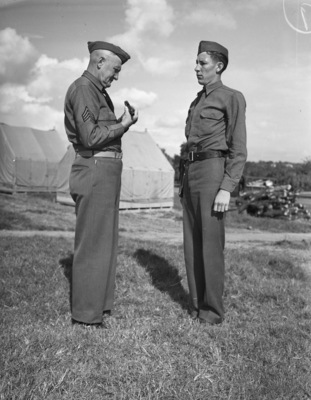 On a slope at the west edge of Sycamore Park, long rows of "winterized" tents -- canvas-covered wooden frames, have been erected for the soldiers' recreation camp being established here. The camp will accommodate 500 soldiers. Shown, left to right, Sergeant J. P. Gregory and Private F. R. Griggs at attention as Sergeant Gregory is inspecting his handgun. Private Griggs is wearing a holster and has a clip in the waist band of his trousers. In the background, two erected canvas tents and a stacked pile of timber can be seen.