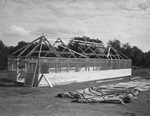 On a slope at the west edge of Sycamore Park, long rows of "winterized" tents -- canvas-covered wooden frames, have been erected for the soldiers' recreation camp being established here. The camp will accommodate 500 soldiers. Shown is a recreation tent being erected. The "tent" is rectangular in floor plan with a hip roof. The frame of the tent and bottom third of the "tent" is constructed out of timber. The middle third of the "tent" is covered with a screen material. The canvas tent that will cover the structure is laid out on the ground to the right of the structure. Two unknown men are standing inside the structure.
