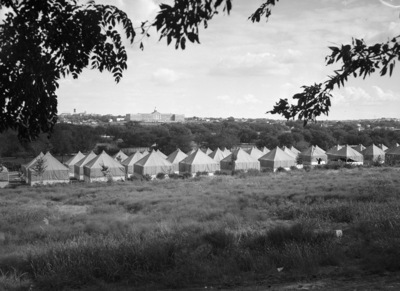 On a slope at the west edge of Sycamore Park, long rows of "winterized" tents -- canvas-covered wooden frames, have been erected for the soldiers' recreation camp being established here. The camp will accommodate 500 soldiers. This view shows the setting of the camp, with the park and Polytechnic High School in the background. Published in the Fort Worth Star-Telegram evening edition, October 30, 1941.