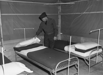 On a slope at the west edge of Sycamore Park, long rows of "winterized" tents -- canvas-covered wooden frames, have been erected for the soldiers' recreation camp being established here. The camp will accommodate 500 soldiers. Show is the interior of one of the tents that will furnish quarters for soldiers who come on leave. There will be 90 of these tents each accommodating six soldiers. Lieutenant Chris Solberg, adjutant and executive officer of the United States Army Recreation area here, is shown inspecting a cot in one of the tents to see that it is properly made up. Three beds can be seen in the canvas covered, wood framed tent. Lieutenant Solberg is wearing an army uniform. Published in the Fort Worth Star-Telegram evening edition, October 30, 1941.