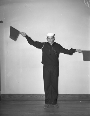 Men of the naval recruiting office wave a greeting to the Nation on Navy Day. Joe Holmes, apprentice seaman, signals "Y," with his right hand flag raised at eye level and the left hand flag raised at shoulder level. He is wearing his military uniform.