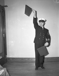 Men of the naval recruiting office wave a greeting to the Nation on Navy Day. M. A. Legros, machinist, first class, signals "D," with his right hand flag raised above his head and the left hand flag down, front and center above knees. He is wearing his military uniform.