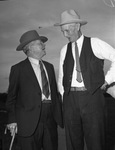 Two former students of Birdville High School returned for homecoming. They are left to right Marsh Calloway, seventy-two, and Rufe Snow, seventy-three. They are two of Birdville's oldest residents and bother were born within a mile of the school They were catching up at the first homecoming program ever staged for students. Mr. Calloway is wearing a hat and suit and walking with a cane. Mr. Snow is dressed in a hat, pinstriped vest, dress shirt, necktie, and trousers.